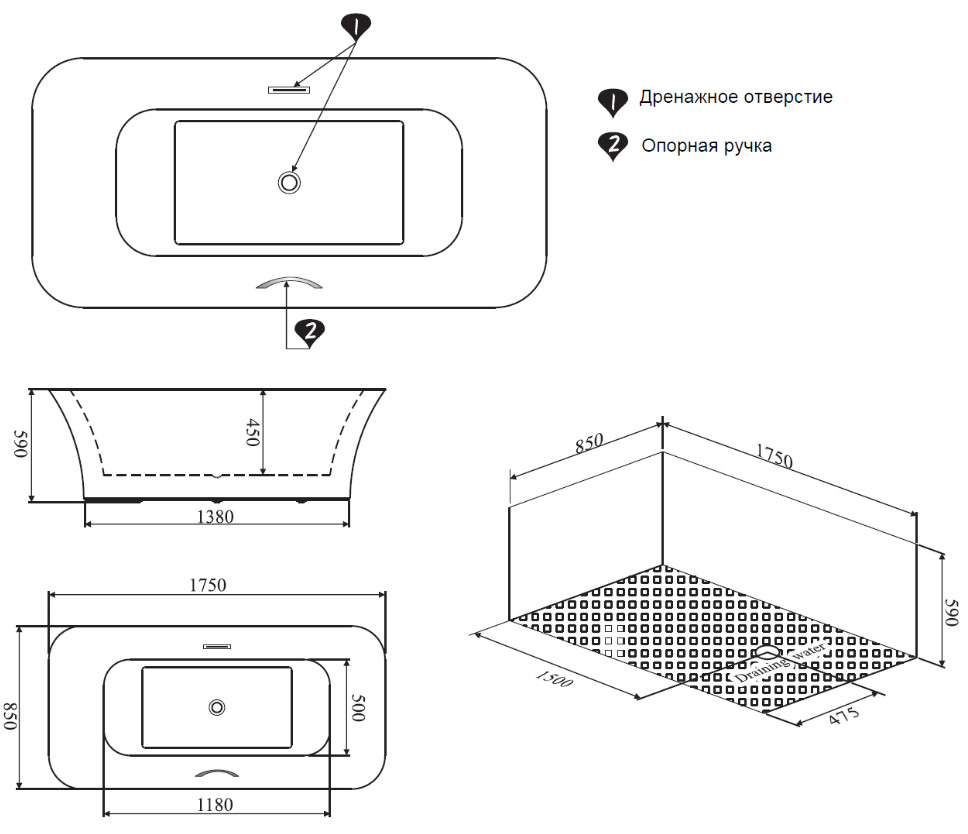 Ванна бесшовная без гидромассажа на усиленном каркасе с панелью, переливное отверстие, донный клапан push-up, плоский сифон, акрил.