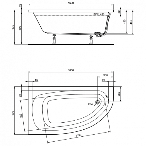 HOTLINE Offset Аси мметричная ванна 160х90 см для встраиваемой установки или для монтажа с панелью, без отверстий под смеситель, левая версия.