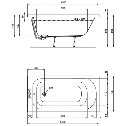 SIMPLICITY Прямоугольная ванна для встраивания, без ножек, без системы слива-перелива, отверстие слива 52 мм, вместимость 160 л.