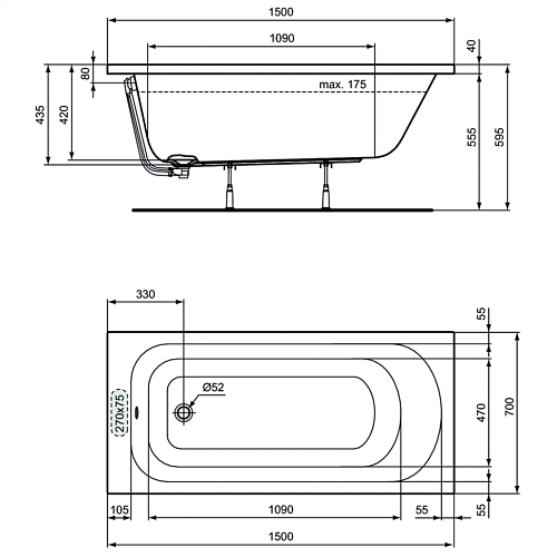 SIMPLICITY Прямоугольная ванна для встраивания или для монтажа с панелями, без ножек, без системы слива-перелива, отверстие слива 52 мм, вместимость 175 л.