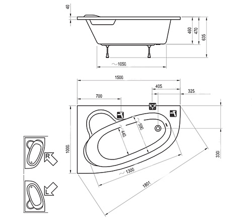 • Габариты: длина 150/160/170 см, ширина 100/105/110 см, объем 190/215/240 л