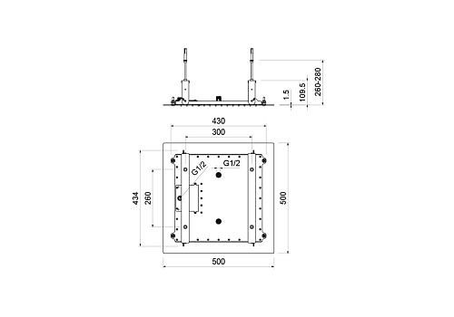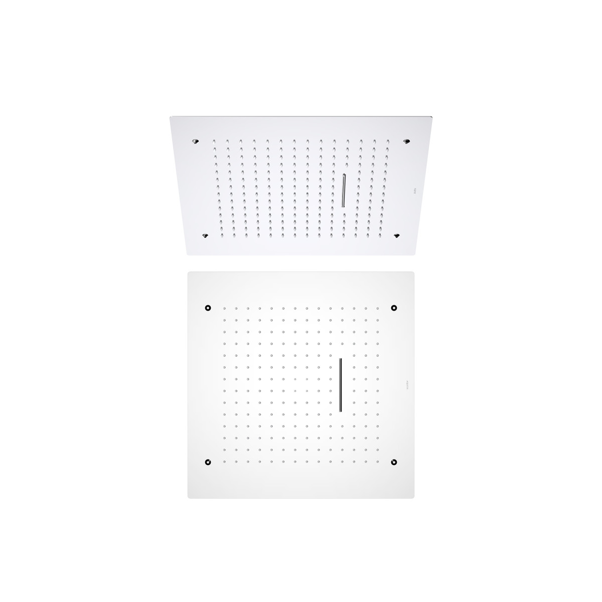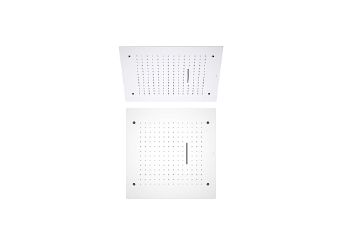 долговечная конструкция из нерж.; устанавливается на потолок; 2 реж. струи: rain+waterfall ; трехслойная прочная конструкция; соединение - внутр. резьба 2х 1/2"; легкая установка; размер: 500x500 мм