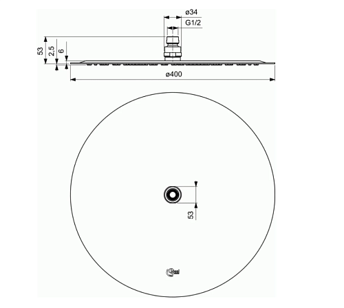 IDEALRAIN LUXE Круглый верхний душ 400 мм, ультратонкий дизайн, 1-функциональный, ограничение потока 12 л/мин. легкоочищаемый (резиновые форсунки), полированная нержавеющая сталь.