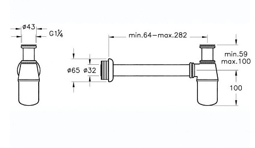 • Для слива диаметром 1.1/4" дюйма • Диапазон установки (вертикальный): 41–106 мм • Расстояние до стены: 64–305 мм • Металлическая погружная труба.