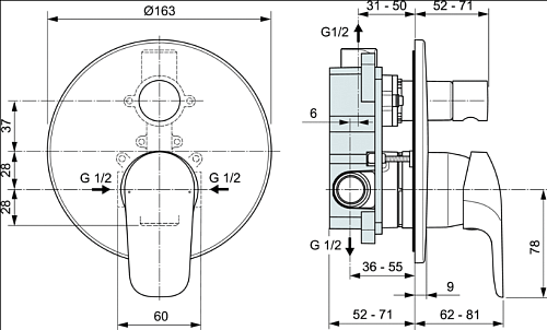 CERAFLEX Встраиваемый смеситель для ванны/душа, комплект №1 A1300NU (встраиваемая часть) + комплект №2 (внешняя часть), керамический картридж 47 мм, с функцией HWTC (ограничение максимальной температуры горячей воды), с функцией CLICK (ограничение потока воды), металлическая рукоятка, индикатор холодной/горячей воды.