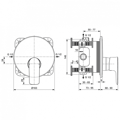 CONNECT AIR Встраиваемый смеситель для душа, для монтажа с комплектом A1000NU, керамический картридж 47 мм, с функцией HWTC (ограничение максимальной температуры горячей воды), с функцией CLICK (ограничение потока воды). CONNECT AIR Встраиваемый смеситель для душа.