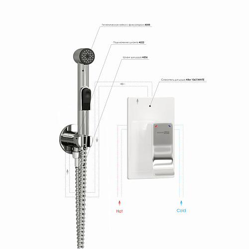Оснащение Смеситель для душа Aller 10651WHITE, Подключение шланга A022, Шланг для душа 1000 мм А056, Гигиеническая лейка с фиксатором A043