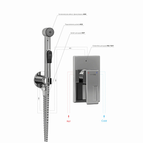 Оснащение Смеситель для душа Aller 10651, Подключение шланга A022, Шланг для душа 1200 мм А057, Гигиеническая лейка с фиксатором A043