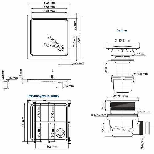 1) Душевые поддоны выполнены из акрила. Толщина акрила поддонов – 5 мм. 2)Прочный металлический каркас из нержавеющей стали и крепеж к стене. 4)Регулируемые ножки по высоте. Позволяют компенсировать неровности пола 5) Съемный экран. В случае засора или протечки сифона экран легко снимается, благодаря чему проблему легко устранить и для этого не надо демонтировать сам поддон.6) В комплект входит сифон с ситечком и гидрозатвором 7) Идеально сочетаются с душевым уголком Amper 29S02 8) Гарантия 2 года