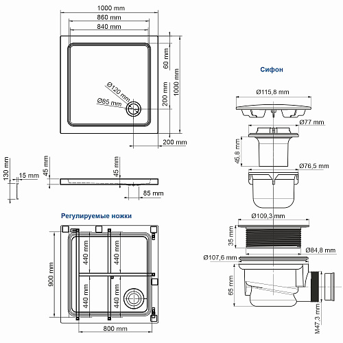 1) Душевые поддоны выполнены из акрила. Толщина акрила поддонов – 5 мм. 2)Прочный металлический каркас из нержавеющей стали и крепеж к стене. 4)Регулируемые ножки по высоте. Позволяют компенсировать неровности пола 5) Съемный экран. В случае засора или протечки сифона экран легко снимается, благодаря чему проблему легко устранить и для этого не надо демонтировать сам поддон.6) В комплект входит сифон с ситечком и гидрозатвором 7) Идеально сочетается с душевым уголком Main 41S19, Salm 27I19, Berkel 48P19. 7) Гарантия 2 года