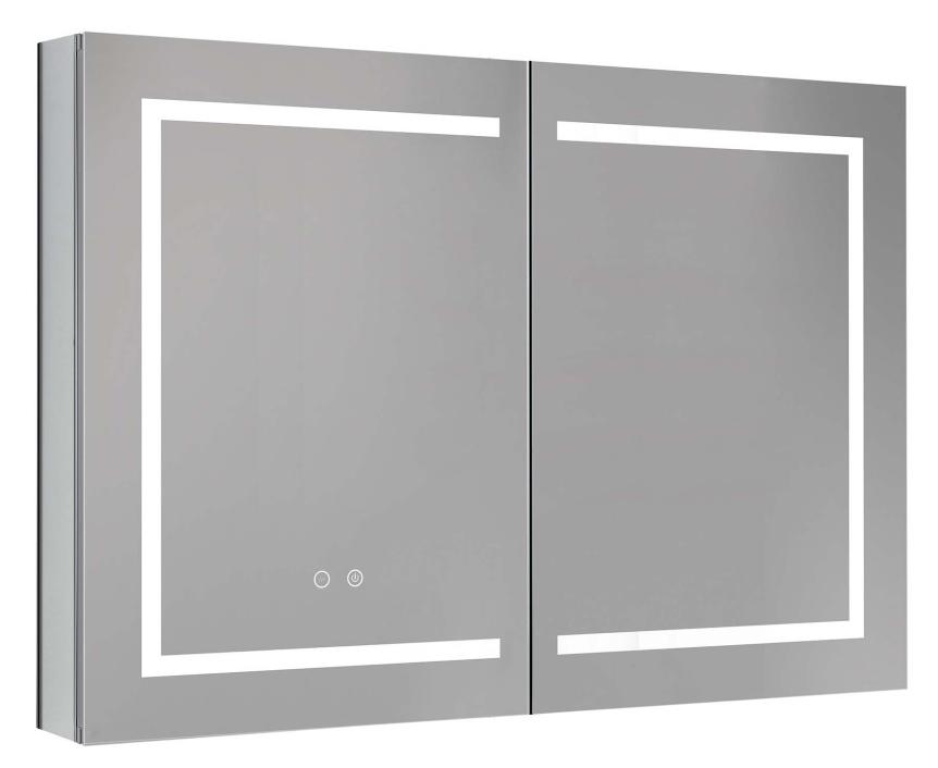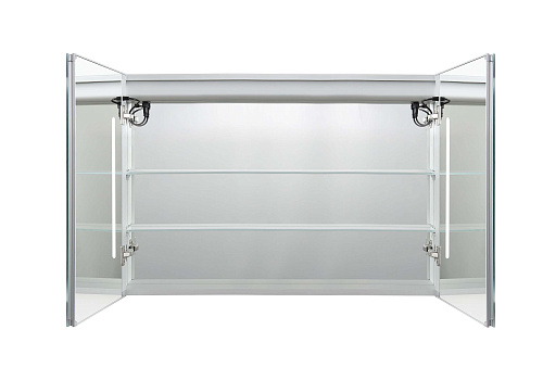 Алюминиевый зеркальный шкаф с подсветкой; Две зеркальные дверцы шириной 49,85 см; Две стеклянные полки 8 мм; Круговая подсветка SMD 2835-120P, цветовая температура 2500K/6500K; Антизапотевание; 2 режима переключения света/ цвета; Сенсорное управление; Двусторонняя зеркальная дверь и зеркальные боковины; С механизмом доводчика, обеспечивающим плавное закрывание; Мебель поставляется в собранном виде; Дополнительное оснащение зеркала: подвесы; Монтаж подвесной; Гарантия: 1 год