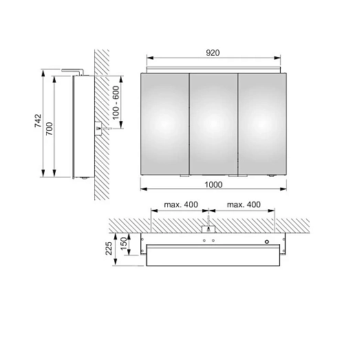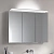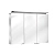Три поворотные дверцы с хрустальным двойным зеркалом, боковины корпуса зеркальные. Внешняя панель управления с функциями: вкл/выкл, реостат/диммер. Выбор освещения - 3 варианта. Подсветка: встроенный светильник с подсветкой на зеркало и стену с дополнительной подсветкой на раковину, тон подсветки 3000 Кельвин (теплая белая), светодиоды 31 В т (срок службы > 30.000 часов горения), бесступенчатый реостат/диммер