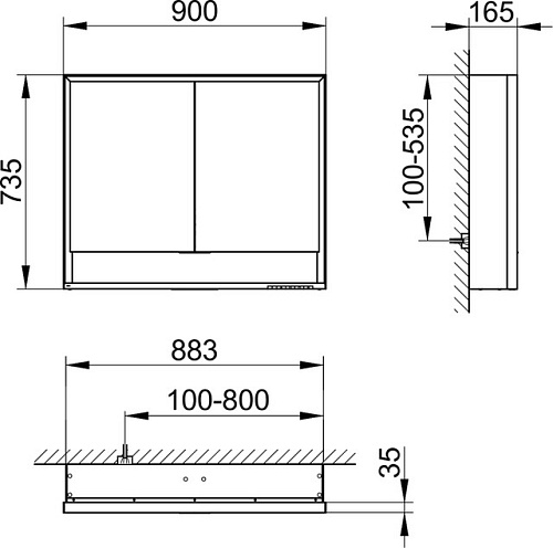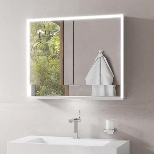 Бесступенчатая настройка тона подсветки от 2700 Кельвин (теплая белая) до 6500 Кельвин (дневной свет), 2 поворотные дверцы с двусторонним озеркаливанием стекла, корпус из анодированного серебристого алюминия, боковины корпуса из белого лакированного стекла, задняя стенка зеркальная. Управление: сенсорные клавиши на корпусе шкафа, встроенная функция отдельного включения от общего выключателя в помещении. Подсветка: общая подсветка и подсветка умывальника/полочки отдельно плавно регулируются и включаются/выключаются, светодиоды 58 Вт (срок службы > 30.000 часов горения), бесступенчатый реостат/диммер.