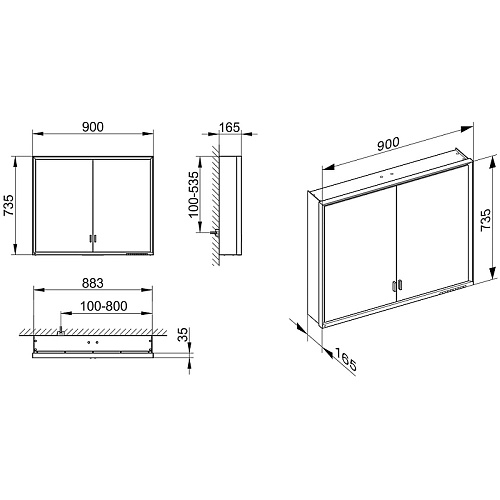Бесступенчатая настройка тона подсветки от 2700 Кельвин (теплая белая) до 6500 Кельвин (дневной свет), 2 поворотные дверцы с двусторонним озеркаливанием стекла, корпус из анодированного серебристого алюминия, боковины корпуса из белого лакированного стекла, задняя стенка зеркальная. Управление: сенсорные клавиши на корпусе шкафа, встроенная функция отдельного включения от общего выключателя в помещении. Подсветка: общая подсветка и подсветка умывальника/полочки отдельно плавно регулируются и включаются/выключаются, светодиоды 58 Вт (срок службы > 30.000 часов горения), бесступенчатый реостат/диммер.