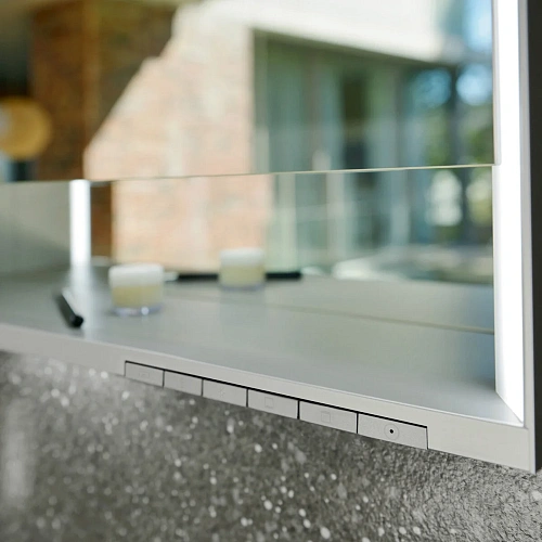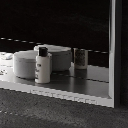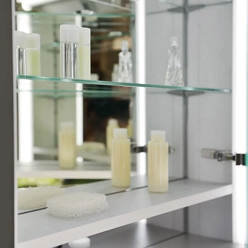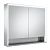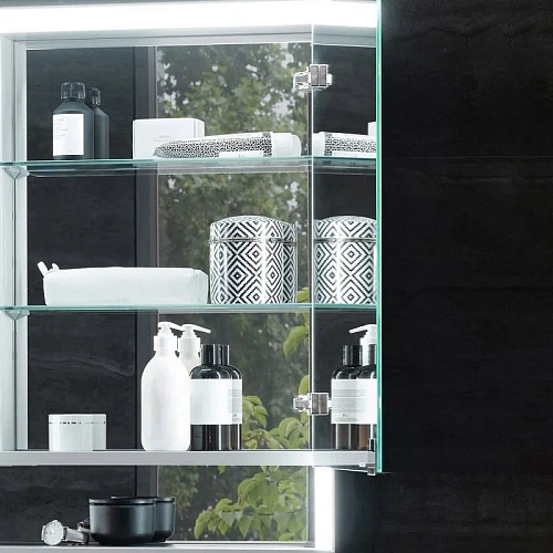 С подогревом, бесступенчатая настройка тона подсветки от 2700 Кельвин (теплая белая) до 6500 Кельвин (дневной свет), 2 поворотные дверцы с двусторонним озеркаливанием стекла, корпус из анодированного серебристого алюминия, задняя стенка зеркальная. Управление: сенсорные клавиши на корпусе шкафа, встроенная функция отдельного включения от общего выключателя в помещении. Подогрев зеркала: 60 Вт, оптическая индикация фазы нагревания, автоматическое отключение через 20 мин. Подсветка: общая подсветка и подсветка умывальника/полочки отдельно плавно регулируются и включаются/выключаются, бесступенчатый реостат/диммер, светодиоды 60 Вт (срок службы > 30.000 часов горения).