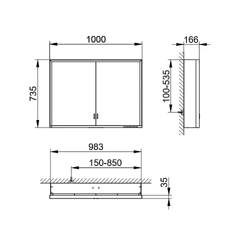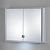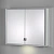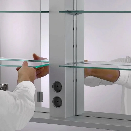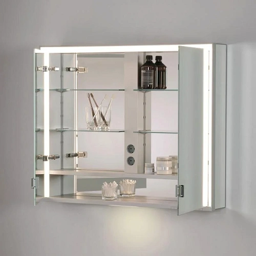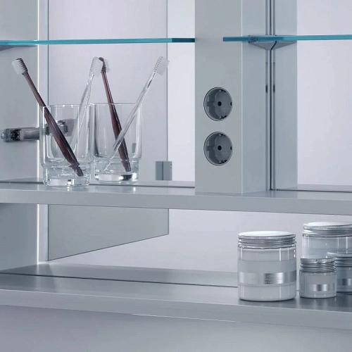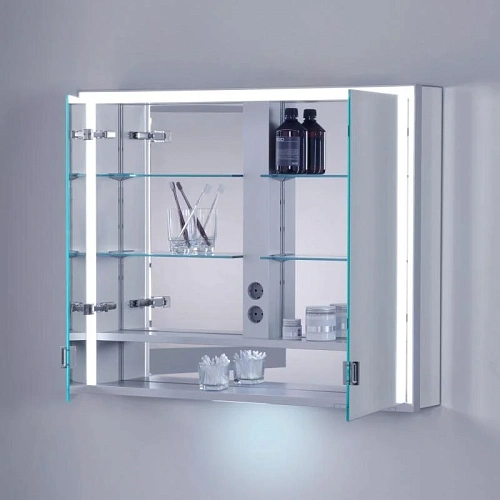 Бесступенчатая настройка тона подсветки от 2700 Кельвин (теплая белая) до 6500 Кельвин (дневной свет), 2 поворотные дверцы с двусторонним озеркаливанием стекла, корпус из анодированного серебристого алюминия, боковины корпуса из белого лакированного стекла, задняя стенка зеркальная. Управление: сенсорные клавиши на корпусе шкафа, встроенная функция отдельного включения от общего выключателя в помещении. Подсветка: общая подсветка и подсветка умывальника/полочки отдельно плавно регулируются и включаются/выключаются, светодиоды 60 Вт (срок службы > 30.000 часов горения), бесступенчатый реостат/диммер.