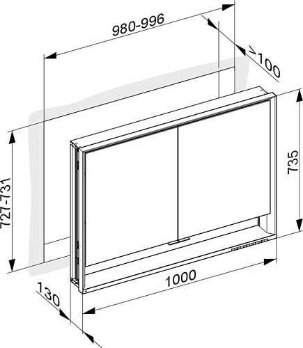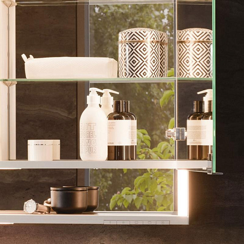 Бесступенчатая настройка тона подсветки от 2700 Кельвин (теплая белая) до 6500 Кельвин (дневной свет), 2 поворотные дверцы с двусторонним озеркаливанием стекла, корпус из анодированного серебристого алюминия, задняя стенка зеркальная. Управление: сенсорные клавиши на корпусе шкафа, встроенная функция отдельного включения от общего выключателя в помещении. Подогрев зеркала: 60 Вт, оптическая индикация фазы нагревания, автоматическое отключение через 20 мин. Подсветка: общая подсветка и подсветка умывальника/полочки отдельно плавно регулируются и включаются/выключаются, бесступенчатый реостат/диммер, светодиоды 60 Вт (срок службы > 30.000 часов горения).