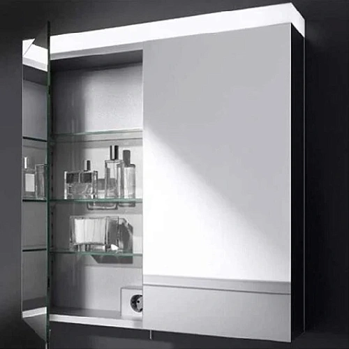 Две поворотные дверцы с хрустальным двойным зеркалом, боковины корпуса зеркальные. Внешняя панель управления с функциями: вкл/выкл, реостат/диммер. Выбор освещения - 3 варианта. Подсветка: подсветка сверху и подсветка раковины, тон подсветки 3000 Кельвин (теплая белая), светодиоды 22 Вт (срок службы > 30.000 часов горения), бесступенчатый реостат/диммер.