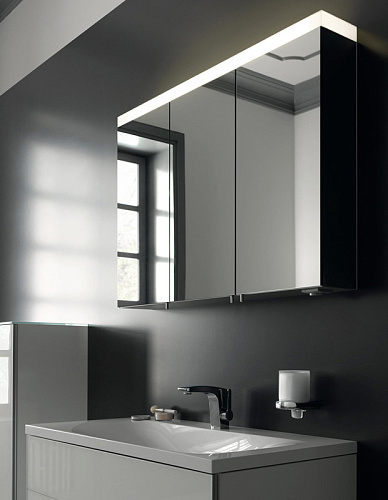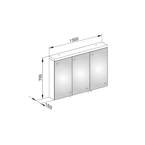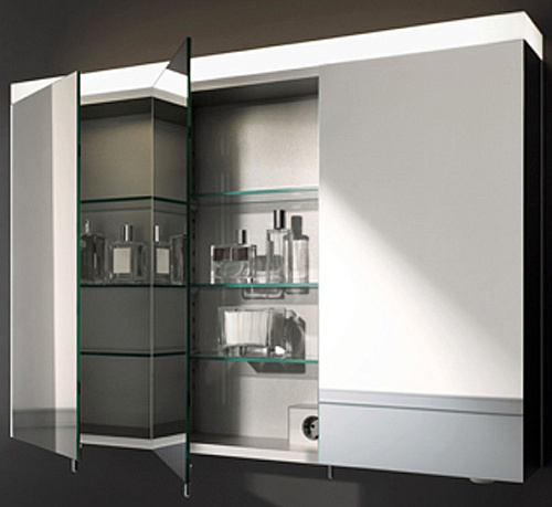 Три поворотные дверцы с хрустальным двойным зеркалом, боковины корпуса зеркальные. Внешняя панель управления с функциями: вкл/выкл, реостат/диммер. Выбор освещения - 3 варианта. Подсветка: подсветка сверху и подсветка раковины, тон подсветки 3000 Кельвин (теплая белая), светодиоды 40 Вт (срок службы > 30.000 часов горения), бесступенчатый реостат/диммер.