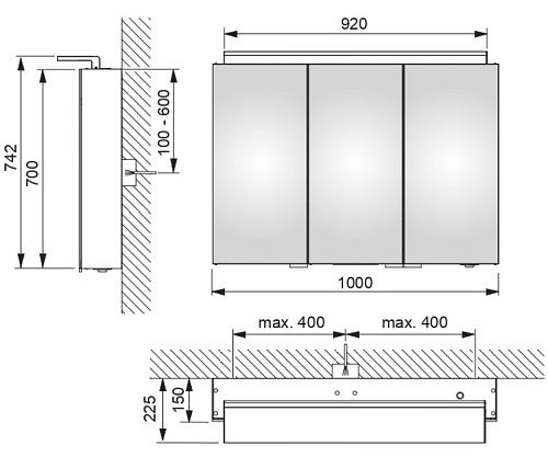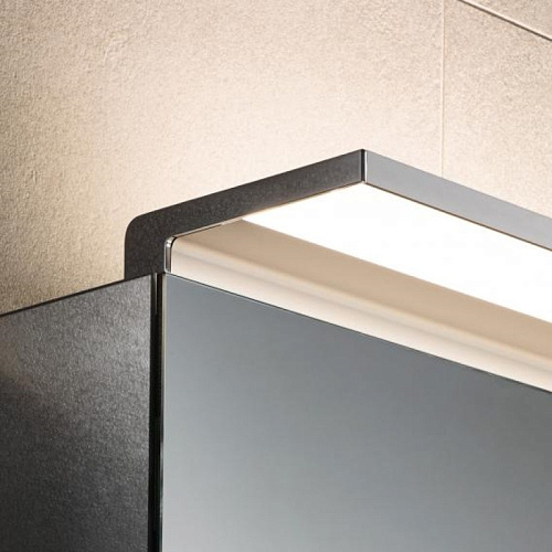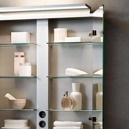 Три поворотные дверцы с хрустальным двойным зеркалом, боковины корпуса зеркальные. Внешняя панель управления с функциями: вкл/выкл, реостат/диммер. Выбор освещения - 3 варианта. Подсветка: встроенный светильник с подсветкой на зеркало и стену с дополнительной подсветкой на раковину, тон подсветки 3000 Кельвин (теплая белая), светодиоды 31 В т (срок службы > 30.000 часов горения), бесступенчатый реостат/диммер