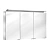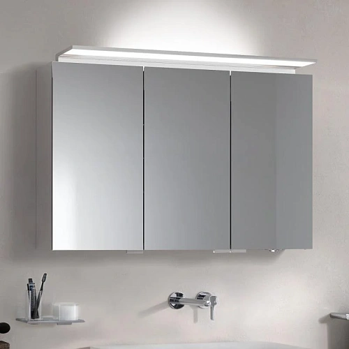 Три поворотные дверцы с хрустальным двойным зеркалом, боковины корпуса зеркальные. Внешняя панель управления с функциями: вкл/выкл, реостат/диммер. Выбор освещения - 3 варианта. Подсветка: встроенный светильник с подсветкой на зеркало и стену с дополнительной подсветкой на раковину, тон подсветки 3000 Кельвин (теплая белая), светодиоды 42 В т (срок службы > 30.000 часов горения), бесступенчатый реостат/диммер
