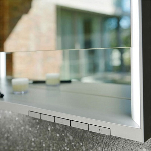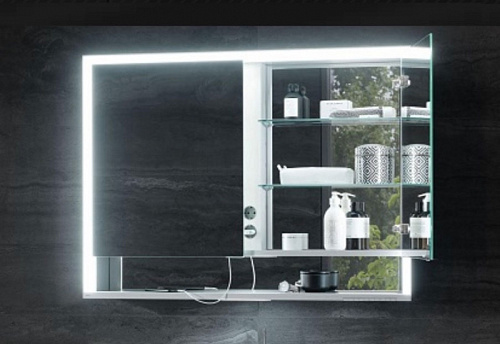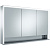 Бесступенчатая настройка тона подсветки от 2700 Кельвин (теплая белая) до 6500 Кельвин (дневной свет), 3 поворотные дверцы с двусторонним озеркаливанием стекла, корпус из анодированного серебристого алюминия, боковины корпуса из белого лакированного стекла, задняя стенка зеркальная. Управление: сенсорные клавиши на корпусе шкафа, встроенная функция отдельного включения от общего выключателя в помещении. Подсветка: общая подсветка и подсветка умывальника/полочки отдельно плавно регулируются и включаются/выключаются, светодиоды 65 Вт (срок службы > 30.000 часов горения), бесступенчатый реостат/диммер.