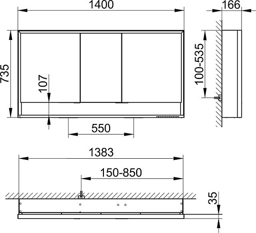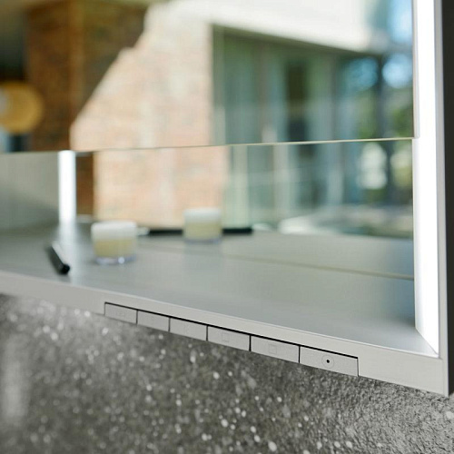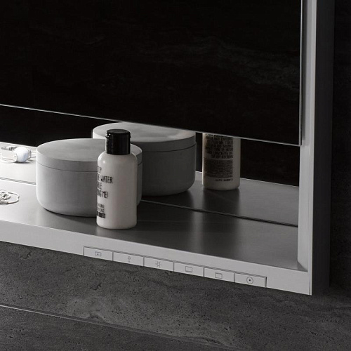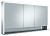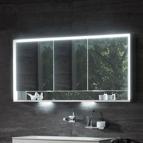 С подогревом, бесступенчатая настройка тона подсветки от 2700 Кельвин (теплая белая) до 6500 Кельвин (дневной свет), 3 поворотные дверцы с двусторонним озеркаливанием стекла, корпус из анодированного серебристого алюминия, задняя стенка зеркальная. Управление: сенсорные клавиши на корпусе шкафа, встроенная функция отдельного включения от общего выключателя в помещении. Подогрев зеркала: 90 Вт, оптическая индикация фазы нагревания, автоматическое отключение через 20 мин. Подсветка: общая подсветка и подсветка умывальника/полочки отдельно плавно регулируются и включаются/выключаются, бесступенчатый реостат/диммер, светодиоды 68 Вт (срок службы > 30.000 часов горения).