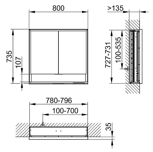 Бесступенчатая настройка тона подсветки от 2700 Кельвин (теплая белая) до 6500 Кельвин (дневной свет), 2 поворотные дверцы с двусторонним озеркаливанием стекла, корпус из анодированного серебристого алюминия, задняя стенка зеркальная. Управление: сенсорные клавиши на корпусе шкафа, встроенная функция отдельного включения от общего выключателя в помещении. Подсветка: общая подсветка и подсветка умывальника/полочки отдельно плавно регулируются и включаются/выключаются, светодиоды 56 Вт (срок службы > 30.000 часов горения), бесступенчатый реостат/диммер.