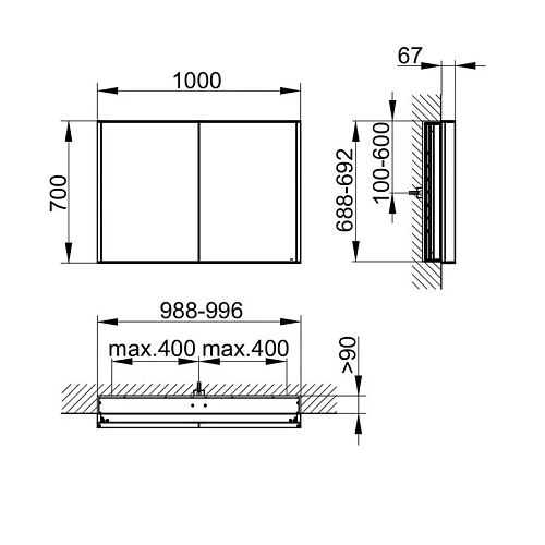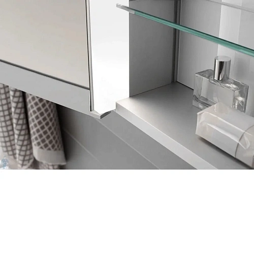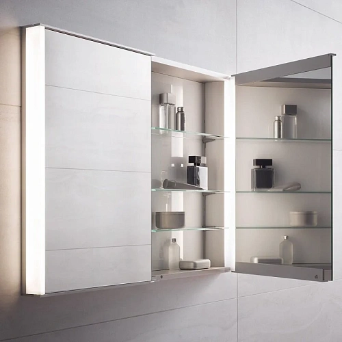 Две поворотные зеркальные дверцы из двойного хрустального стекла, корпус из анодированного серебристого алюминия, задняя стенка из покрытого с тыльной стороны белым лаком стекла. Управление: сенсорная передняя панель, можно включать и от общего выключателя в помещении. Подсветка: светодиоды 2x12,5 Вт (срок службы > 30.000 часов горения.), тон подсветки 3000 Кельвин (тепло-белая) бесступенчатая реостатная регулировка, лампы не требуют замены.