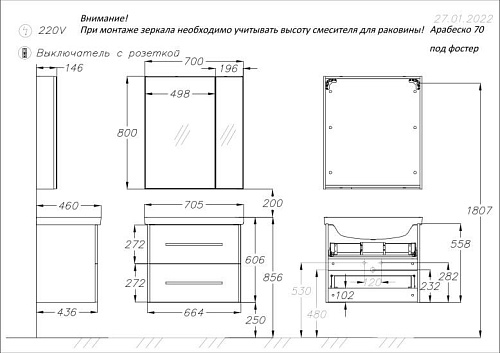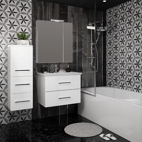 Коллекция подвесной мебели АРАБЕСКО строгая и лаконичная. Подвесная тумба прямоугольной формы с изящной ручкой, двумя выдвижными ящиками с системой «плавного закрывания», глубокой керамической раковиной и зеркалом. В коллекцию также входит подвесной пенал с двумя выдвижными ящиками и дверцей. Мебель из коллекции АРАБЕСКО покрыта влагостойкой эмалью с глянцевым лаком.