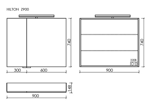 Зеркальный шкаф для ванной комнаты SANCOS Hilton 900x148х740 мм, фасады выполнены из безопасного 2-х стороннего зеркального полотна по технологии триплекс, LED светильник, внутренняя розетка с выключателем, арт. Z900