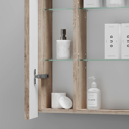 Зеркальный шкаф для ванной комнаты SANCOS Mirror 690x150х740 мм, с LED подсветкой, корпус выполнен из лдсп цвет дуб галифакс натуральный, диммируемое сенсорное управление подсветкой, 4 полки стекло, с розеткой арт. MI70EG