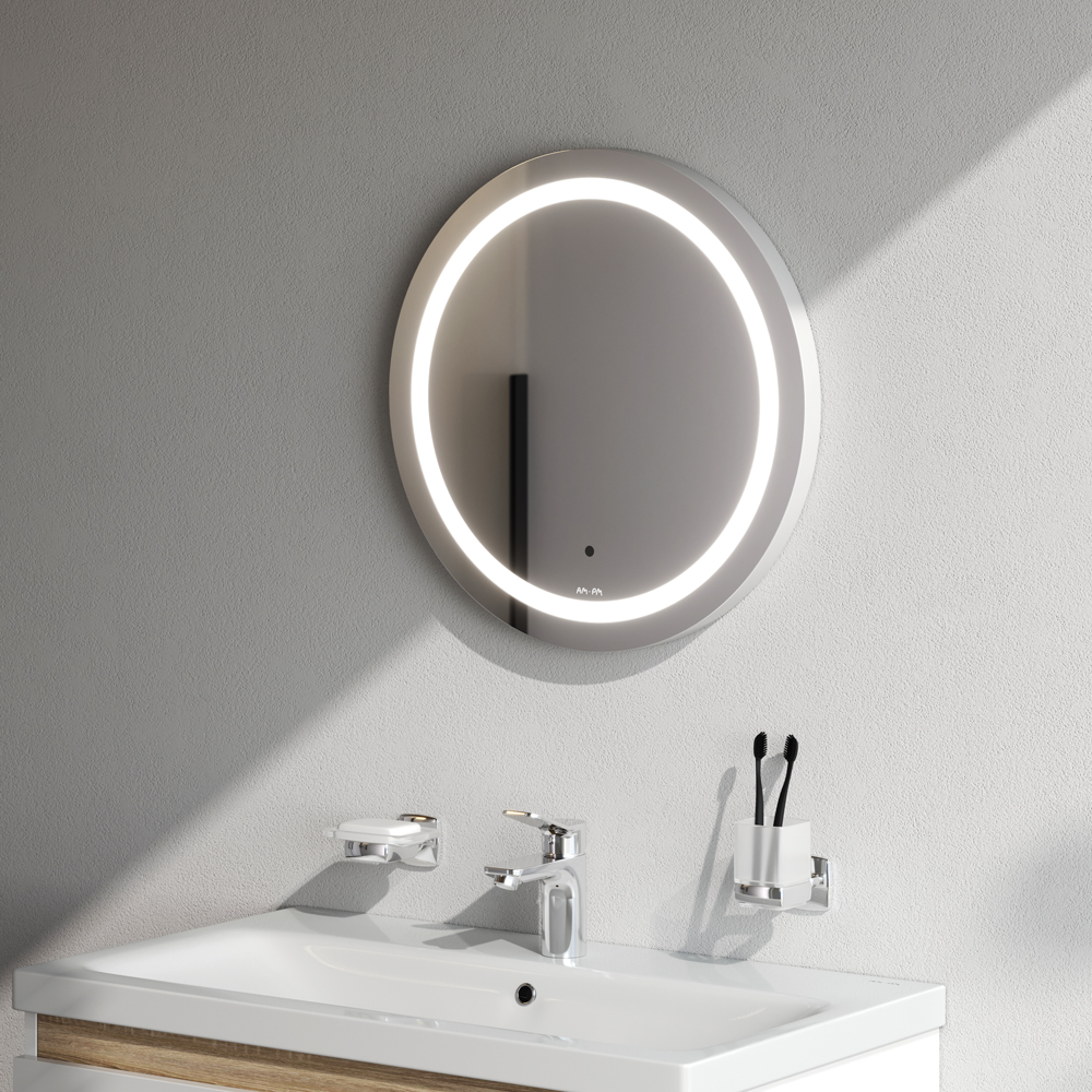 Расширение размерной линейки зеркал AM.PM. Зеркало с LED-подсветкой и бесконтактным сенсором в размере 50 см. Ультрамодный универсальный дизайн зеркала от собственной студии дизайна AM.PM Design подойдет к интерьеру любой ванной комнаты. Зеркальное полотно от ведущего европейского производителя зеркал AGC. Изделие имеет высокую степень защиты от попадания капель воды брызг. Край зеркального полотна обработан еврокромкой что обеспечивает надежную защиту от случайных порезов при контакте с изделием. Яркая контурная LED-подсветка обеспечивает отличное рассеянное освещение и отсутствие теней. Срок службы светодиодов составляет более 30 000 часов. Бесконтактный сенсорный выключатель Touchless – никаких отпечатков на зеркальном полотне! Свет включается легким взмахом руки. Функция диммирования позволяет регулировать яркость жестом. Гарантия 3 года ""