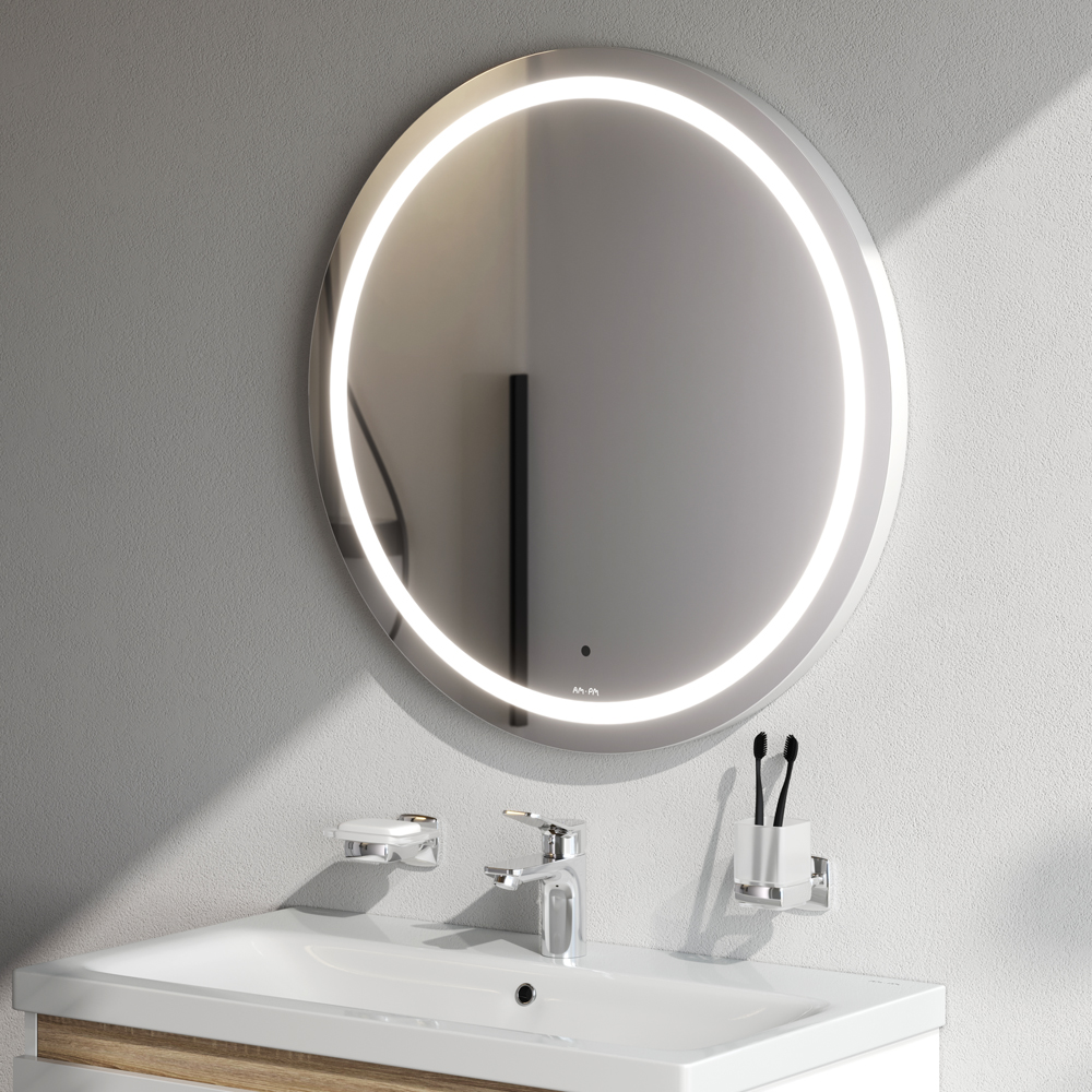 Расширение размерной линейки зеркал AM.PM. Зеркало с LED-подсветкой и бесконтактным сенсором в размере 70 см. Ультрамодный универсальный дизайн зеркала от собственной студии дизайна AM.PM Design подойдет к интерьеру любой ванной комнаты. Зеркальное полотно от ведущего европейского производителя зеркал AGC. Изделие имеет высокую степень защиты от попадания капель воды брызг. Край зеркального полотна обработан еврокромкой что обеспечивает надежную защиту от случайных порезов при контакте с изделием. Яркая контурная LED-подсветка обеспечивает отличное рассеянное освещение и отсутствие теней. Срок службы светодиодов составляет более 30 000 часов. Бесконтактный сенсорный выключатель Touchless – никаких отпечатков на зеркальном полотне! Свет включается легким взмахом руки. Функция диммирования позволяет регулировать яркость жестом. Гарантия 3 года ""
