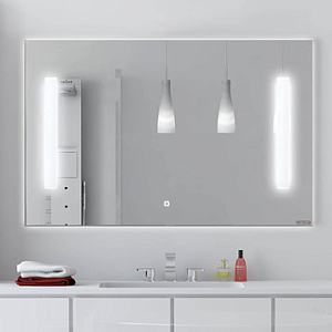 Зеркальное высококачественное полотно с амальгамой на основе серебра. Зеркало оснащено светодиодной подсветкой в виде двух вертикальных полос по краям полотна, и сенсорным выключателем