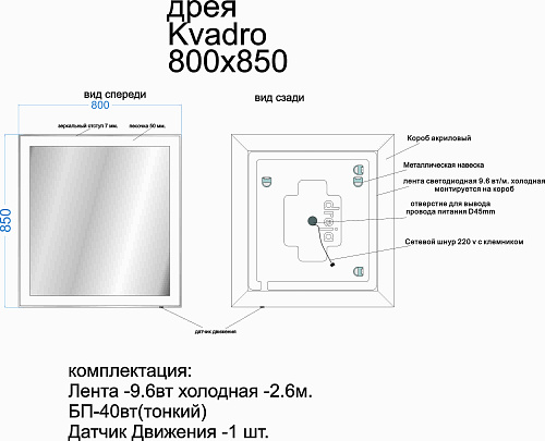 Зеркало Dreja 77.9012W Kvadro, 80x85 см, инфракрасный выключатель/LED-подсветка, белое