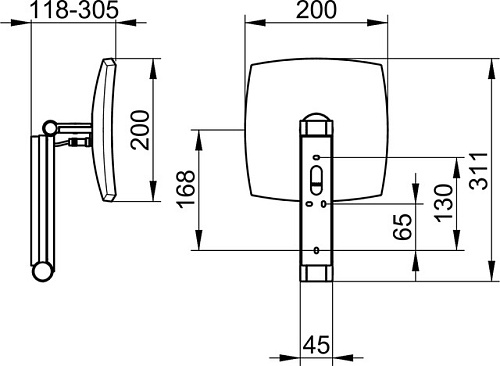 Один цвет подсветки 6500 Кельвин (дневной свет), управления через выключатель в помещении, электрокабель интегрирован в поворотный кронштейн, настенная модель на кронштейне с шарниром, регулируется в трех плоскостях, одностороннее зеркало, вогнутое, коэффициент увеличения x 5. Управление: выключатель в помещении (не поставляется с товаром). Электроснабжение: подключение к сети через подрозетник, 12 В встраиваемый сетевой блок питания. Напряжение на входе: 220-240 В. Потребление в режиме ожидания: 0 Вт. Подсветка: светодиод 7 Вт (срок работы > 50.000 часов).