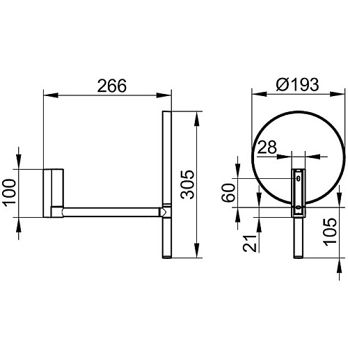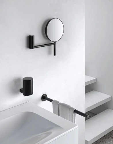 Без подсветки, поворотное, настенная модель на шарнире, трехмерная регулировка. Двустороннее зеркало плоское и вогнутое, коэффициент увеличения x 5.