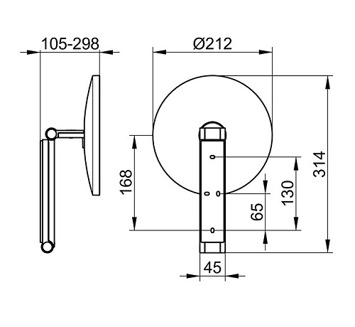 Без подсветки, настенная модель на кронштейне с шарниром, регулируется в трех плоскостях. Одностороннее зеркало, вогнутое, фактор увеличения x 5.