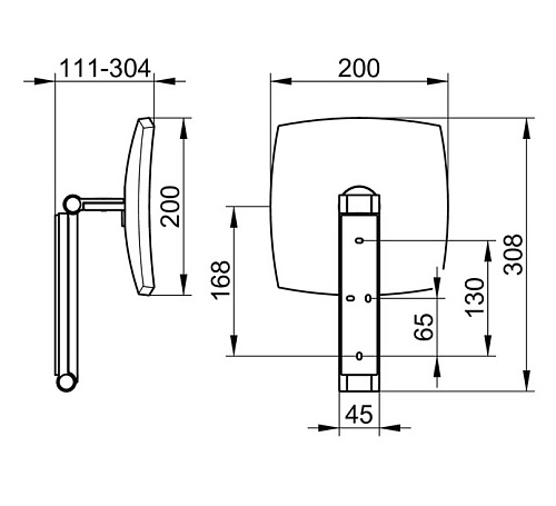 Без подсветки, настенная модель на кронштейне с шарниром, регулируется в трех плоскостях. Одностороннее зеркало, вогнутое, фактор увеличения x 5.