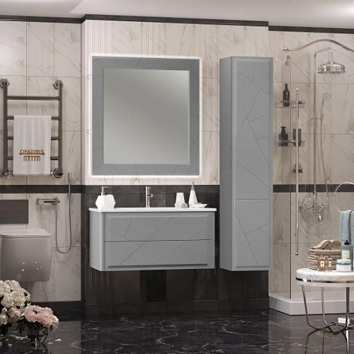 Коллекцию ЛУИДЖИ украшают сложная фрезеровка фасадов строгими линиями и декоративная подсветка по периметру зеркала, которое оснащено сенсорным выключателем. Тумбы дополняются современными ультратонкими керамическими слим-раковинами в размерах 70 см и 90 см. Коллекция изготавливается в цветах Белый матовый и серый матовый. Мебель оснащена механизмами плавного закрывания Hettich (Германия).