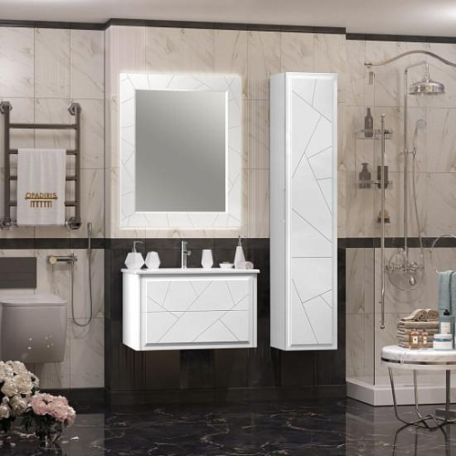 Коллекцию ЛУИДЖИ украшают сложная фрезеровка фасадов строгими линиями и декоративная подсветка по периметру зеркала, которое оснащено сенсорным выключателем. Тумбы дополняются современными ультратонкими керамическими слим-раковинами в размерах 70 см и 90 см. Коллекция изготавливается в цветах Белый матовый и серый матовый. Мебель оснащена механизмами плавного закрывания Hettich (Германия).