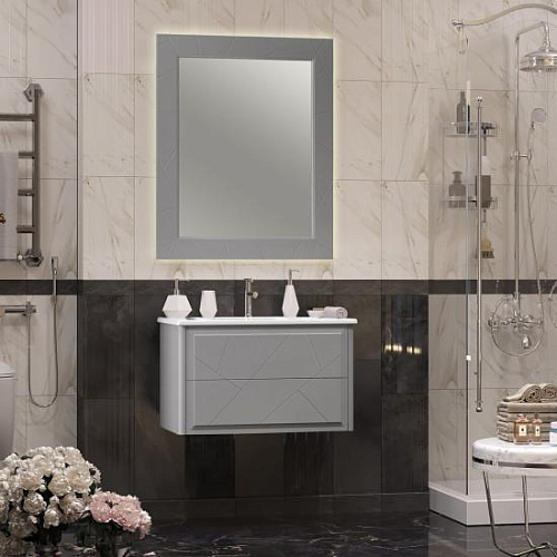Коллекцию ЛУИДЖИ украшают сложная фрезеровка фасадов строгими линиями и декоративная подсветка по периметру зеркала, которое оснащено сенсорным выключателем. Тумбы дополняются современными ультратонкими керамическими слим-раковинами в размерах 70 см и 90 см. Коллекция изготавливается в цветах Белый матовый и серый матовый. Мебель оснащена механизмами плавного закрывания Hettich (Германия).