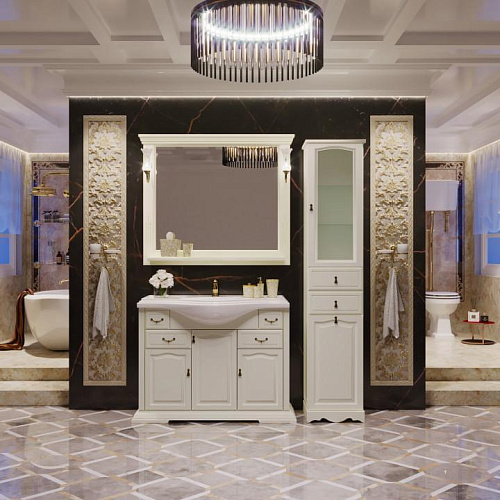 Коллекция РИСПЕКТО символизирует лучше традиции неоклассики в сочетании с необыкновенной функциональностью и простотой дизайна. Успех и уникальность коллекции формируется несколькими вариантами отделок, а также размерным рядом моделей и глубокой керамической раковиной. Завершенность стилю коллекции РИСПЕКТО придают сложные филенчатые фасады мебели. Несколько вариантов пеналов — узкий, стандартный (с бельевой корзиной) и двухстворчатый — удачно завершают комплектацию коллекции. Мебель оснащена механизмами плавного закрывания Hettich (Германия).