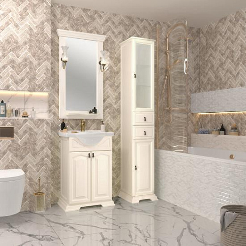 Коллекция РИСПЕКТО символизирует лучше традиции неоклассики в сочетании с необыкновенной функциональностью и простотой дизайна. Успех и уникальность коллекции формируется несколькими вариантами отделок, а также размерным рядом моделей и глубокой керамической раковиной. Завершенность стилю коллекции РИСПЕКТО придают сложные филенчатые фасады мебели. Несколько вариантов пеналов — узкий, стандартный (с бельевой корзиной) и двухстворчатый — удачно завершают комплектацию коллекции. Мебель оснащена механизмами плавного закрывания Hettich (Германия).