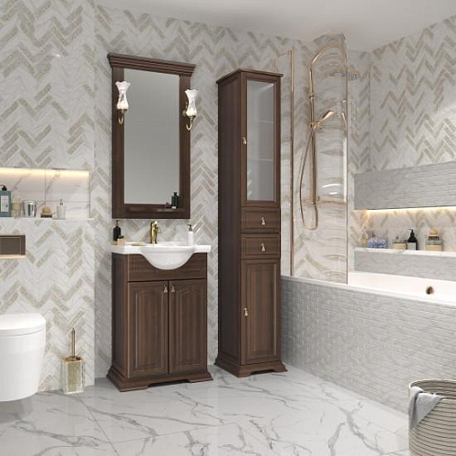 Коллекция РИСПЕКТО символизирует лучше традиции неоклассики в сочетании с необыкновенной функциональностью и простотой дизайна. Успех и уникальность коллекции формируется несколькими вариантами отделок, а также размерным рядом моделей и глубокой керамической раковиной. Завершенность стилю коллекции РИСПЕКТО придают сложные филенчатые фасады мебели. Несколько вариантов пеналов — узкий, стандартный (с бельевой корзиной) и двухстворчатый — удачно завершают комплектацию коллекции. Мебель оснащена механизмами плавного закрывания Hettich (Германия).