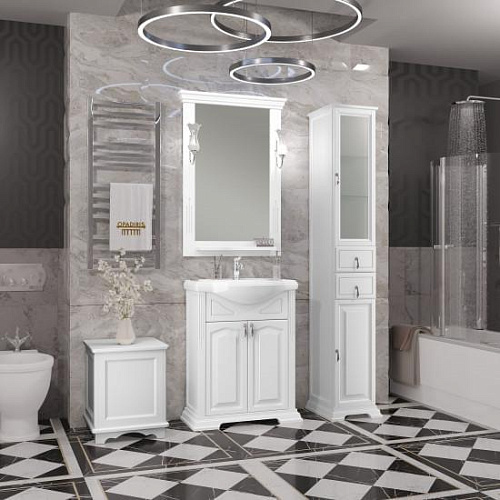 Коллекция РИСПЕКТО символизирует лучше традиции неоклассики в сочетании с необыкновенной функциональностью и простотой дизайна. Успех и уникальность коллекции формируется несколькими вариантами отделок, а также размерным рядом моделей и глубокой керамической раковиной. Завершенность стилю коллекции РИСПЕКТО придают сложные филенчатые фасады мебели. Несколько вариантов пеналов — узкий, стандартный (с бельевой корзиной) и двухстворчатый — удачно завершают комплектацию коллекции. Мебель оснащена механизмами плавного закрывания Hettich (Германия).