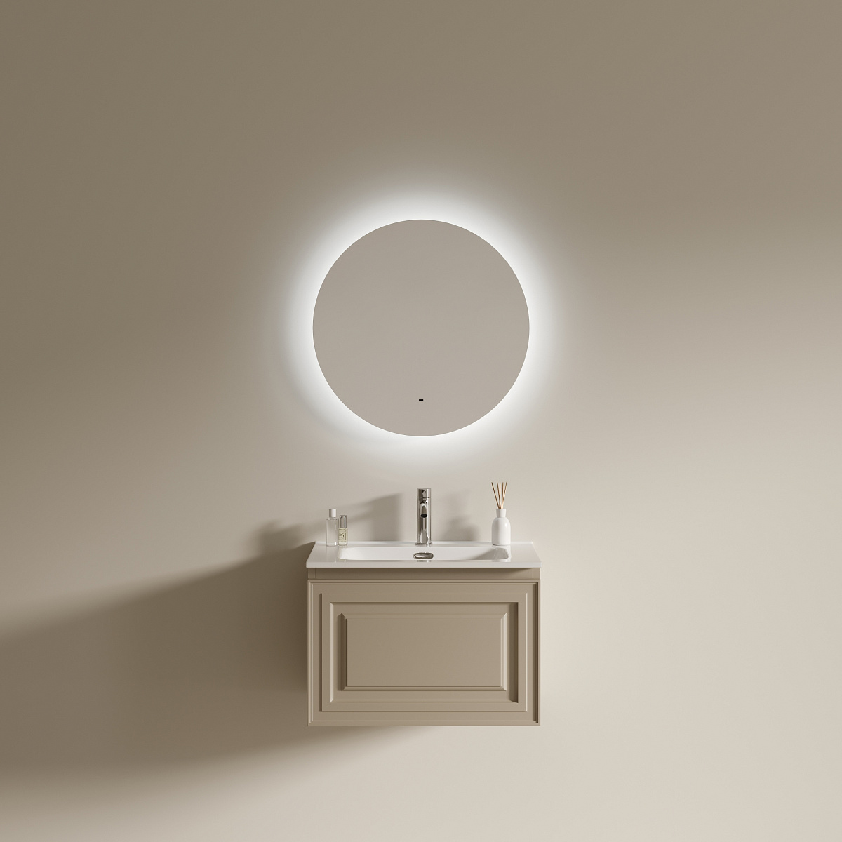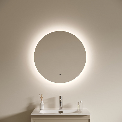 Зеркало для ванной комнаты с подсветкой Ø600 мм Возможность выбора температуры подсветки 2700K/4000K/5000K Выключение и включение подсветки на взмах руки Диммируемое управление яркостью подсветки На изображении зеркало представлено с коллекцией мебели Very и смесителем из коллекции Etna.