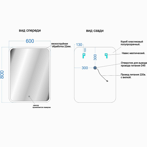 Оснащение LED подсветка, сенсор вкл/ выкл