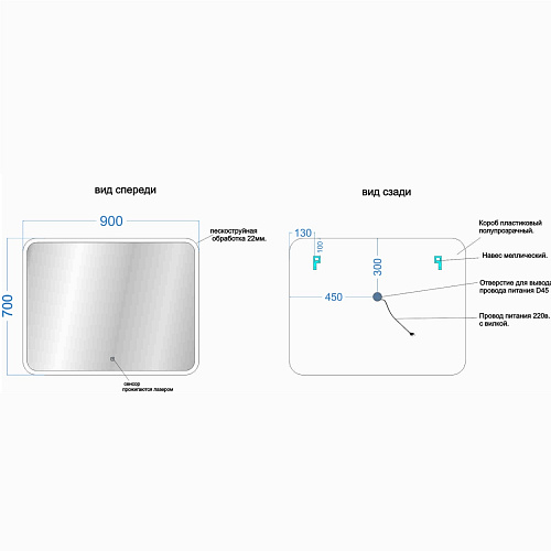 Оснащение LED подсветка, сенсор вкл/ выкл